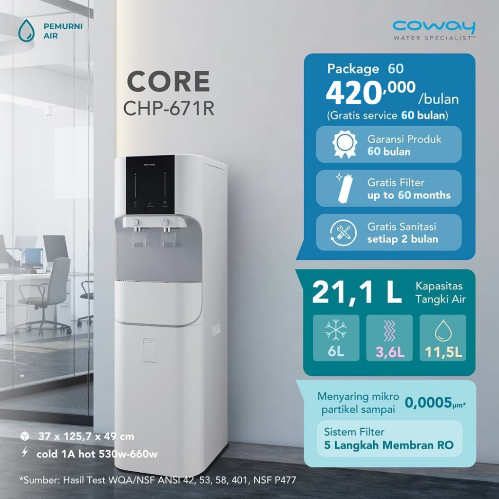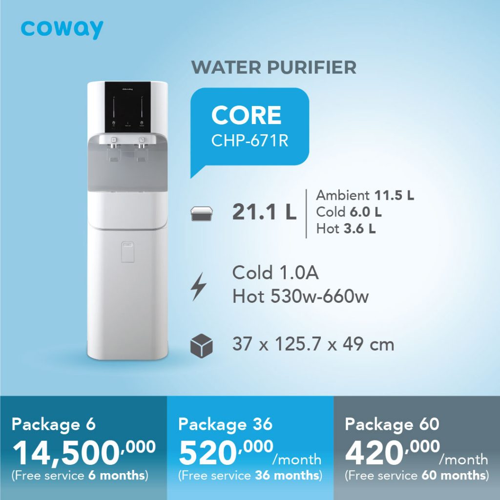 Sekarang lebih hemat dengan CORE Water Purifier, cicilan ringan hanya Rp480.000 / bulan Anda tidak perlu lagi repot-repot isi ulang galon. CORE Water Purifier memurnikan air langsung dari sumber air hingga layak untuk diminum.